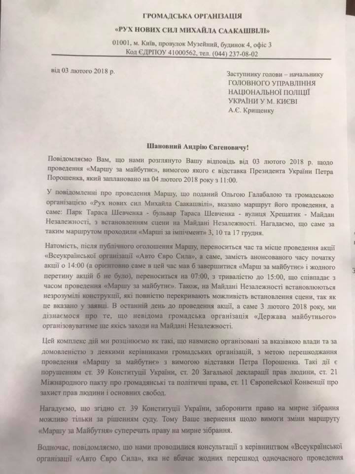 "Отримали лист від Нацполіціі, що "РНС" не може проводити наш Марш з вимогою відставки Порошенка Хрещатиком і Майданом, тому що дві інших організації там проводять свої акції. За дивним збігом обставин, весь Майдан заставили дивними конструкціями ..., а центр буде зайнятий іншими акціями та замість того, щоб забезпечити громадський порядок, поліція наполягає, щоб наша акція протесту не рухалася Хрещатиком і не проводилася на Майдані", - заявила Галабала.