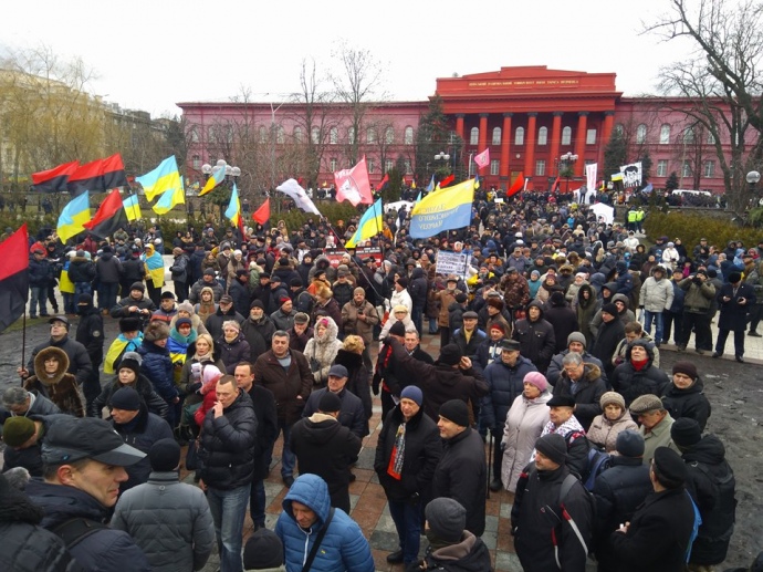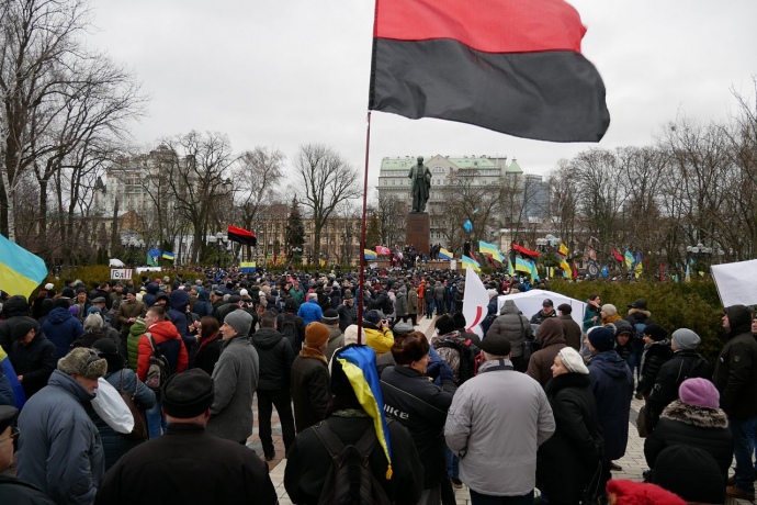 Люди розтягнули біля пам'ятника Шевченку великий білий транспарант "Імпічмент". Тримають українські прапори, символіку громадських організацій.