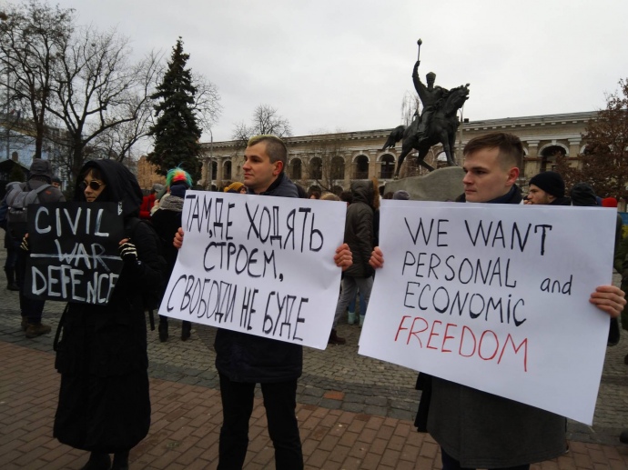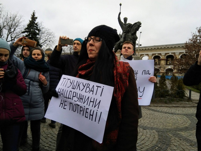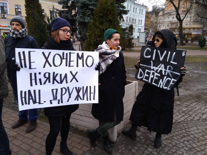Серед лозунгів, які учасники акції проголошують - "Не хочемо ніяких нацдружин", "Там, де ходять строєм, свободи не буде", "Тітушкуваті нацдружини не потрібні", і т.і.