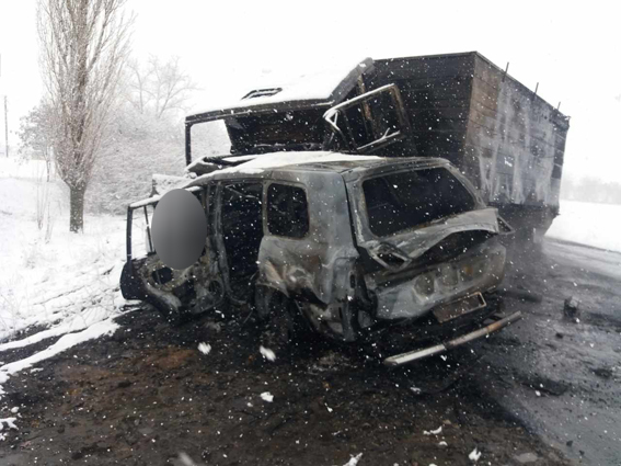 Попередньо встановлено, що внаслідок зіткнення антажного автомобіля "КамАЗ" з причепом та позашляховика Toyota Land Cruiser сталось займання автомобілів.