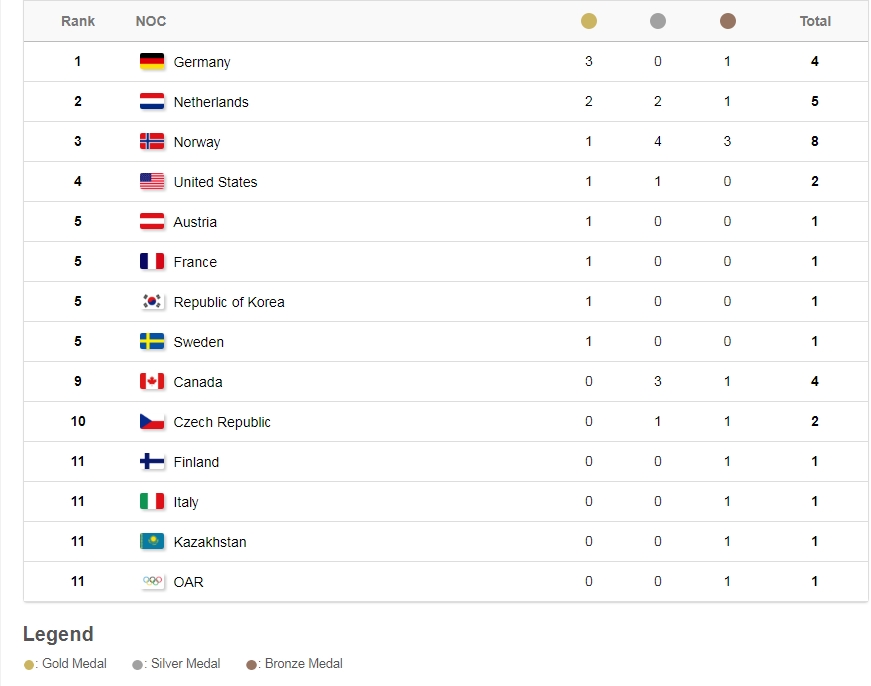 На другій позиції з 5 медалями - команда Нідерландів (2 "золота", 2 "срібла" та 1 "бронза").