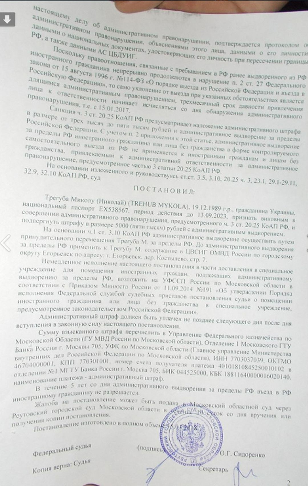 У постанові суду зазначено, що Микола Трегуб - громадянин України, 19.12.1989 р.н., визнаний винним у адміністративному правопорушенні за ч.3 ст.20.25 КоАП РФ, на нього накладено штраф в розмірі 5 тис. рублів і адміністративне видворення "шляхом примусового переміщення за межі РФ ".