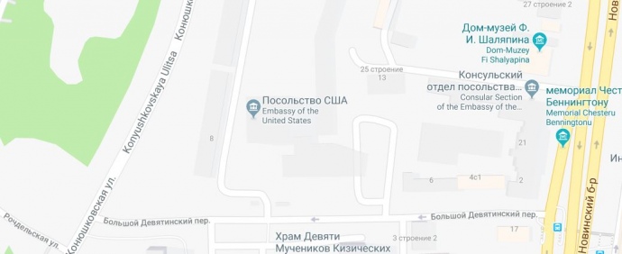 Посольство США в Москві розташоване на перехресті Великого Девятинського провулка та безіменного тупика, який і пропонується назвати "Північноамериканським". Наразі поштова адреса посольства – Великий Девятинский провулок, 8.