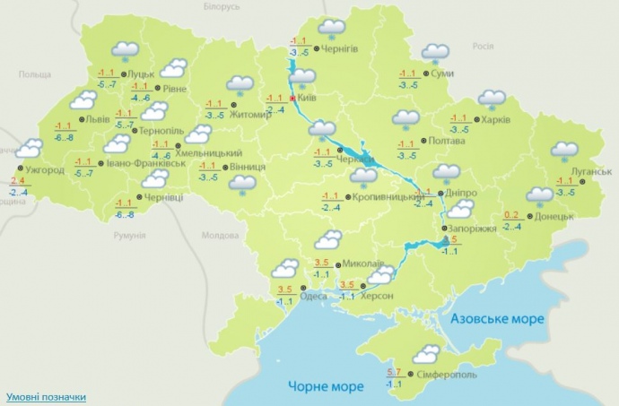 У п'ятницю, 16 лютого, в Україні час від часу очікується невеликий сніг, а в більшості західних і південних областей без опадів.