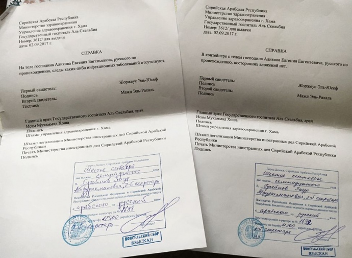 В середині вересня 2017 року з пенсіонеркою Ніною Атюшевою, що живе в селищі Североонезьк Архангельської області, зв'язався чоловік з Ростова-на-Дону. Він представився Андрієм і повідомив, що їй треба приїхати і забрати тіло її сина Євгена Алікова, який загинув у Сирії.