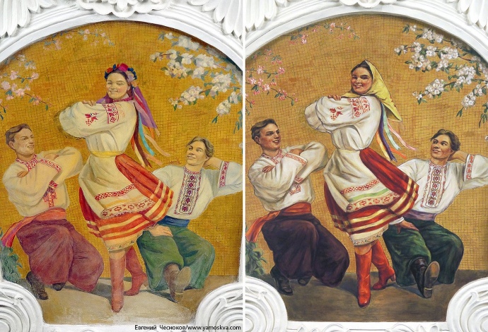 Під час реставрації станції "Київської" московського метрополітену на одній зі стін змінили зображення на фресці - український вінок на голові дівчини замінили на хустинку.