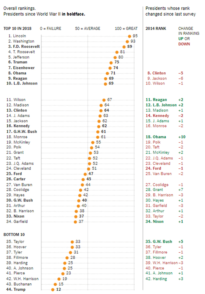 Перше місце в рейтингу з 95 балами посів Авраам Лінкольн, друге – Джордж Вашингтон, третє – Франклін Рузвельт. Також у п’ятірці лідерів Теодор Рузвельт і Томас Джефферсон.