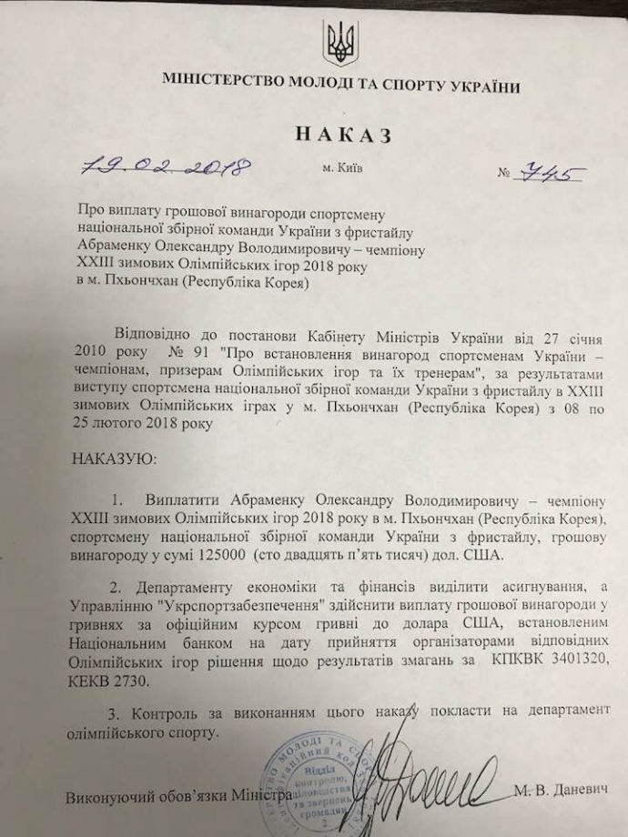 Олімпійському чемпіону з фристайлу Олександру Абраменку виплатять державну нагороду 125 000 доларів у гривневому еквіваленті.