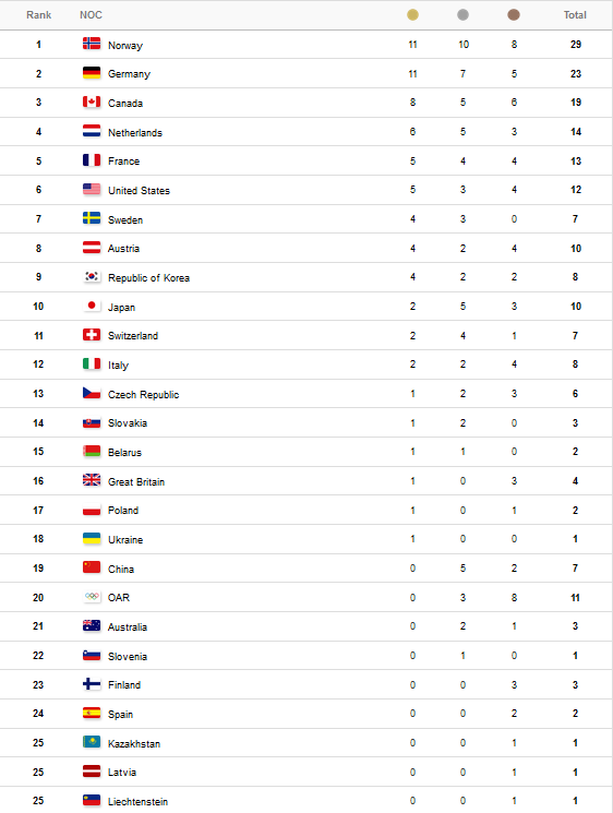 Після 11 днів змагань в активі команди Норвегії перше місце в медальному заліку.
