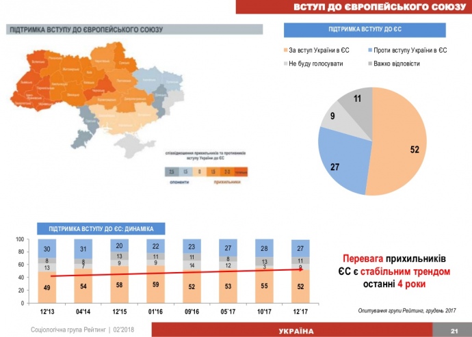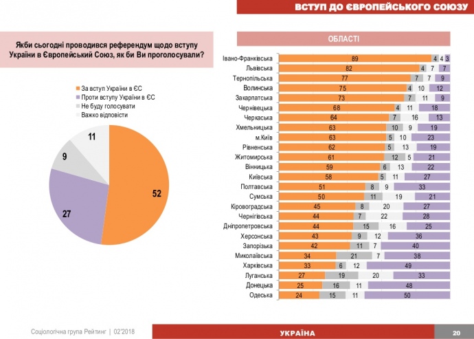 Загалом вступ до ЄС підтримали б у разі проведення референдуму 52% опитаних, проти цієї ініціативи – 27%, не змогли визначитися або ж не брали участь у голосуванні – 20%.