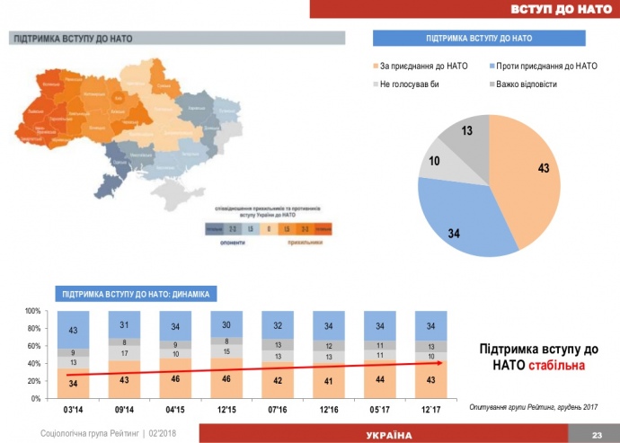 Опитування показало, що за останні три роки кількість прихильників вступу до НАТО зросла у півтора рази. 43% підтримують вступ до Альянсу, 34% – проти цього. Ще майже чверть або ж не визначилися, або ж не приймали б участі у референдумі у разі його проведення.