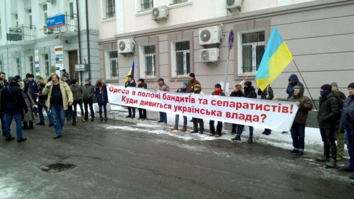 Були присутні під судом і представники "Національного корпусу". Кілька активістів тримають банер з написом: "Одеса в полоні бандитів та сепаратистів! Куди дивиться українська влада?".