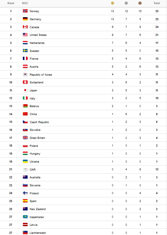 Норвегія виграла 35 нагород (13-12-10). На другій позиції знаходиться Німеччина - 25 (13-7-5). На третьому місці з 24-ма медалями залишається команда Канади - 24 (9-7-8).