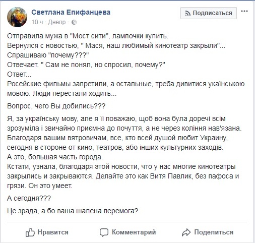 Днями Єпіфанцева розмістила в мережі Facebook пост, який викликав хвилю обурення. Зокрема чиновниця скаржилася, що через український дубляж фільмів люди нібито припинили ходити у кінотеатри, внаслідок чого ті змушені закриватися. Пізніше вона свій пост видалила.
