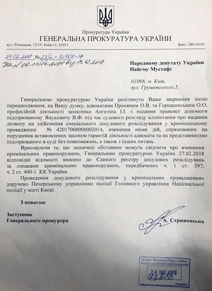 Генеральна прокуратура відкрила провадження за фактом перешкоджання захисниками екс-президента Віктора Януковича державному адвокату Івану Ангеліну.