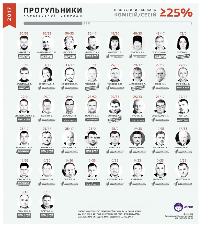 Також серед найбільших прогульників у Харківській облраді – Євген Сироткін з "Опозиційного блоку" – у 2017 році він не відвідав 75% засідань комісії, до якої входить.