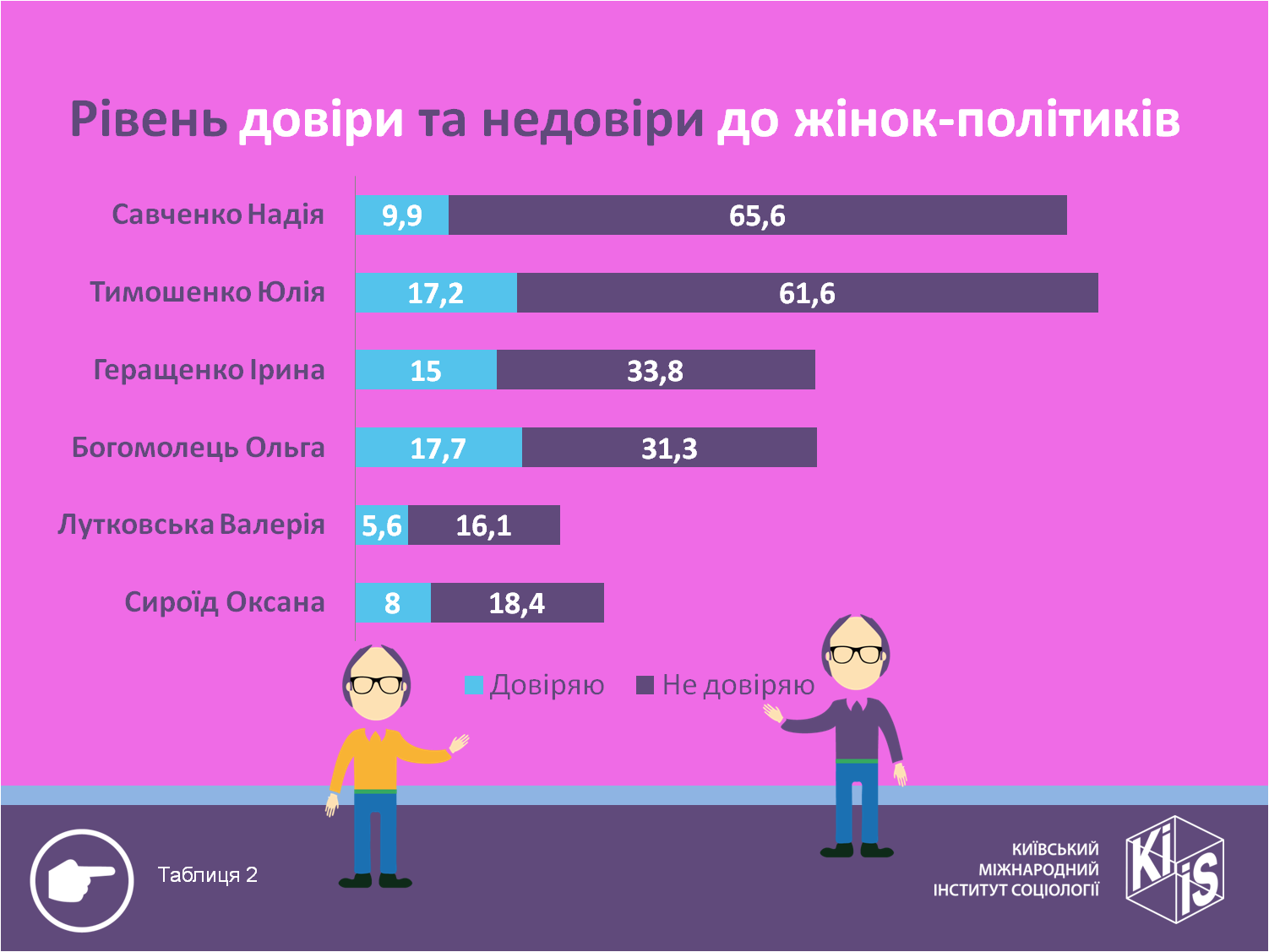 При цьому рівень довіри до жінок нижчий ніж рівень недовіри. Найменший рівень довіри до Лутковської (6%), Сироїд (8%) та Савченко (10%), найбільший – до Богомолец (18%) та Тимошенко (17%), дещо менший до Геращенко (15%).
