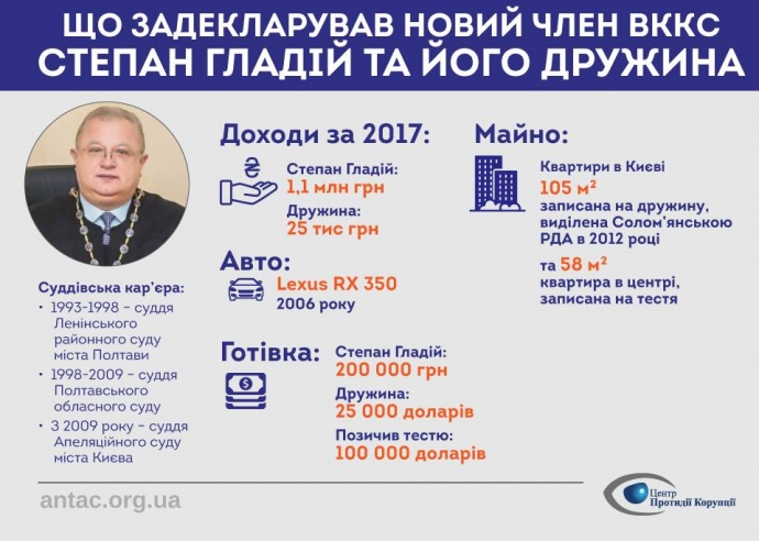 "На питання, як Гладію вдалось позичити тестю 100 тисяч доларів, суддя відповідав, що гроші отримав від продажу квартири та гаражу в Полтаві", - відзначають у ЦПК.