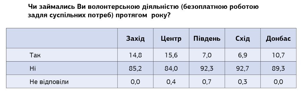 При цьому 7% опитаних зазначили, що залучені до громадської діяльності. Трохи активнішою вважає себе молодь – понад 10% опитаних вказують, що залучені до громадської активності. Найменший рівень залученості спостерігається на сході країни – лише 2%.
