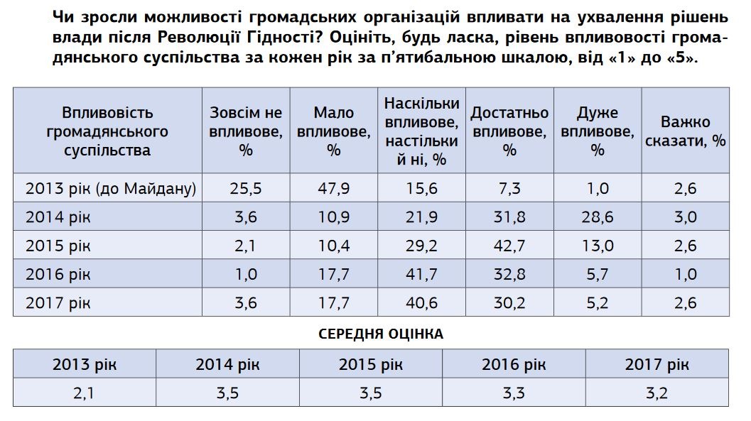 Також опитування виявило, що населення невисоко оцінює розвиток громадянського суспільства в Україні. Так, близько третини опитаних оцінили його рівень як середній, і стільки ж як загалом низький.
