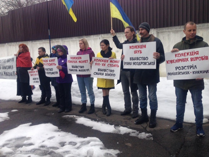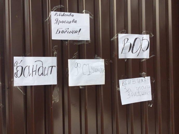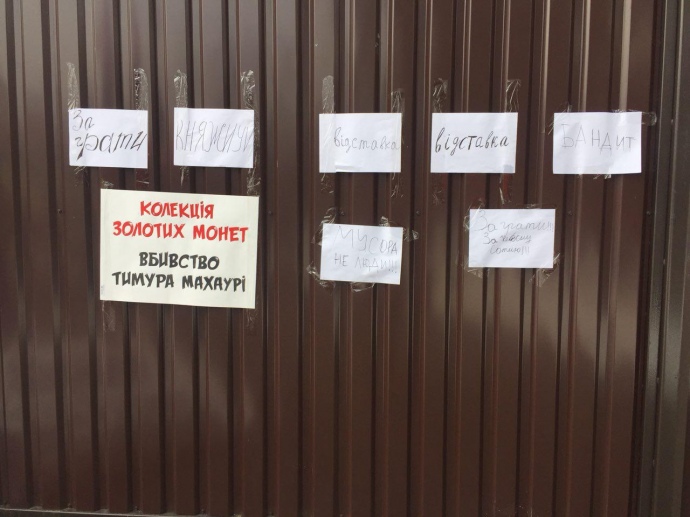 Кілька десятків людей під будинком міністра розгорнули плакати, підняли прапори України та вигукують гасла, у яких висувають претензії до діяльності міністра.