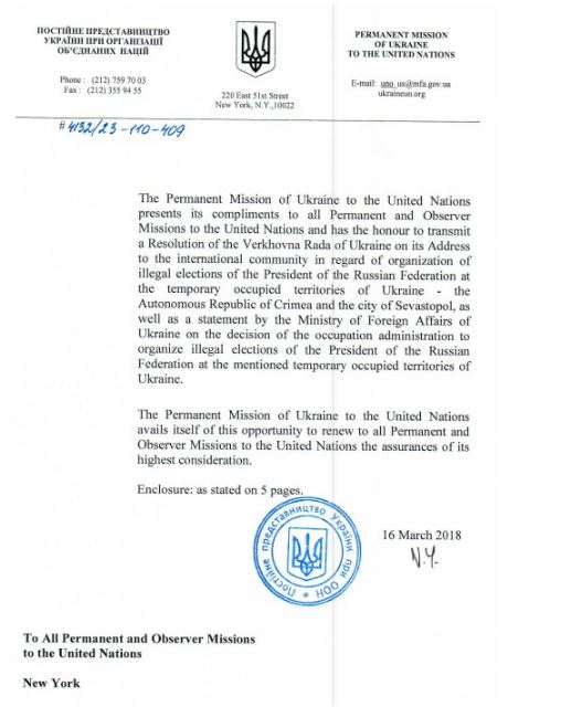 "Маю честь цим листом передати Резолюцію Верховної Ради України з її зверненням до міжнародного співтовариства у зв'язку із організацією незаконних виборів президента РФ на тимчасово окупованій частині території України – в АР Крим та місті Севастополі", – йдеться в листі за підписом постійного представника України при ООН Володимира Єльченка.