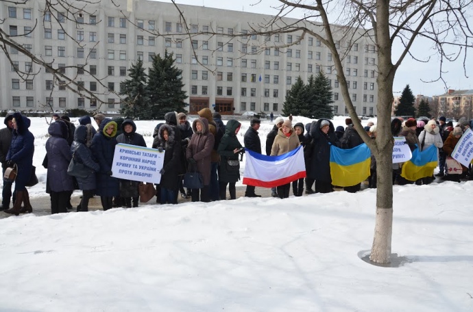 До акції приєдналися представники товариств нацменшин регіону. Активісти принесли з собою українські та кримськотатарські прапори і плакати з написами "Крим - це Україна", "Свободу Криму! Свободу політв'язням!", "Ні виборам президента Росії у Криму" та інші.