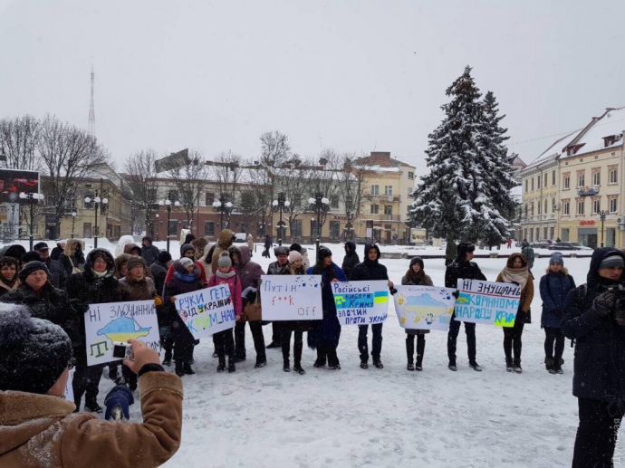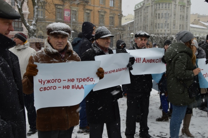"Люди тримали у руках плакати "Крим – не Кремль", "Крим хоче додому", "Крим – це Україна", "Ні виборам у Криму", "Путін геть!", "Львівські студенти проти Путінських виборів у Криму", - зазначає видання.