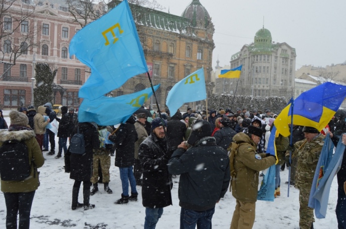 У Львові біля пам'ятника Тарасу Шевченку сотня людей прийшли на громадське віче "Ні "виборам" в Криму!", щоб висловити свою громадську позицію проти "виборів" президента РФ, повідомляє ZIK.