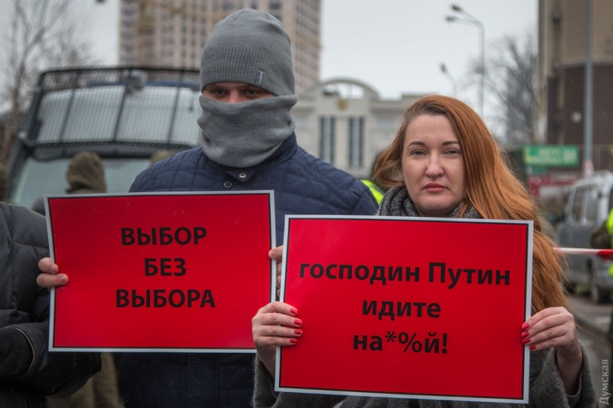 Пікет пройшов перед будівлею консульства РФ, активісти тримали у руках плакати з написами "Пан Путін, йдіть на *%й", "Вибір без вибору" і т.і. На думку учасників акції, "вибори", що проходять на території РФ - "це ганебний цирк".