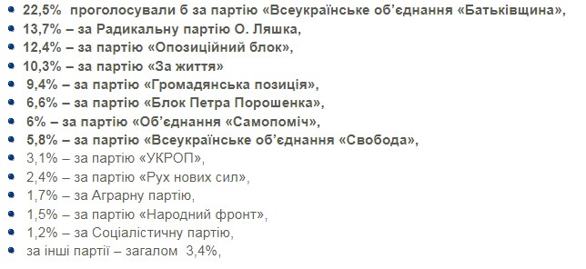 Далі за рівнем підтримки йдуть Радикальна партія Олега Ляшка (13,7%), "Опозиційний блок" (12,4%), партія "За життя" (10,3%), "Громадянська позиція" (9,4%), "Блок Петра Порошенка" (6,6%), "Самопоміч" (6%) і ВО "Свобода" (5,8%).