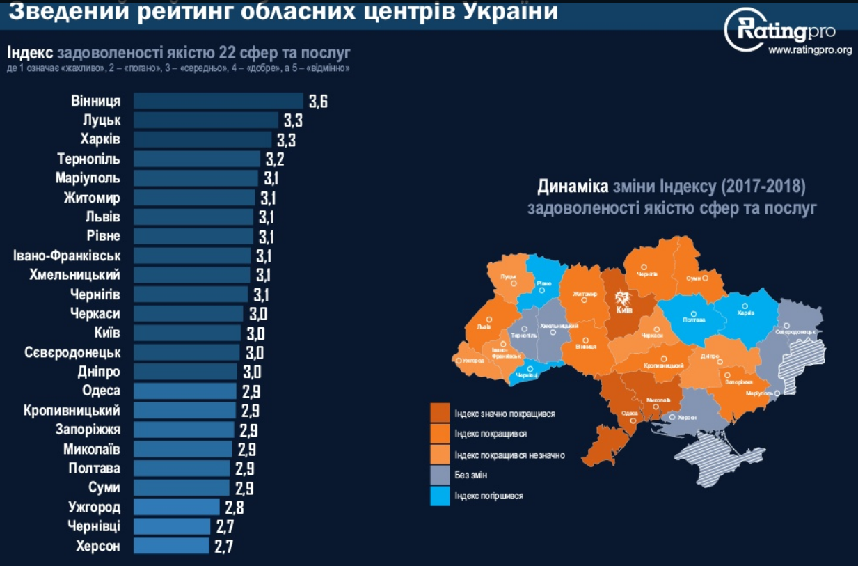 Разом з тим найвищий індекс задоволеності якістю 22 сфер та послуг мають Вінниця (3,6 бали з 5 можливих), Луцьк та Харків (по 3,3 бали). При цьому у Вінниці та Луцька цей показник за 2017-2018 рр. покращився, у Харкова - погіршився.