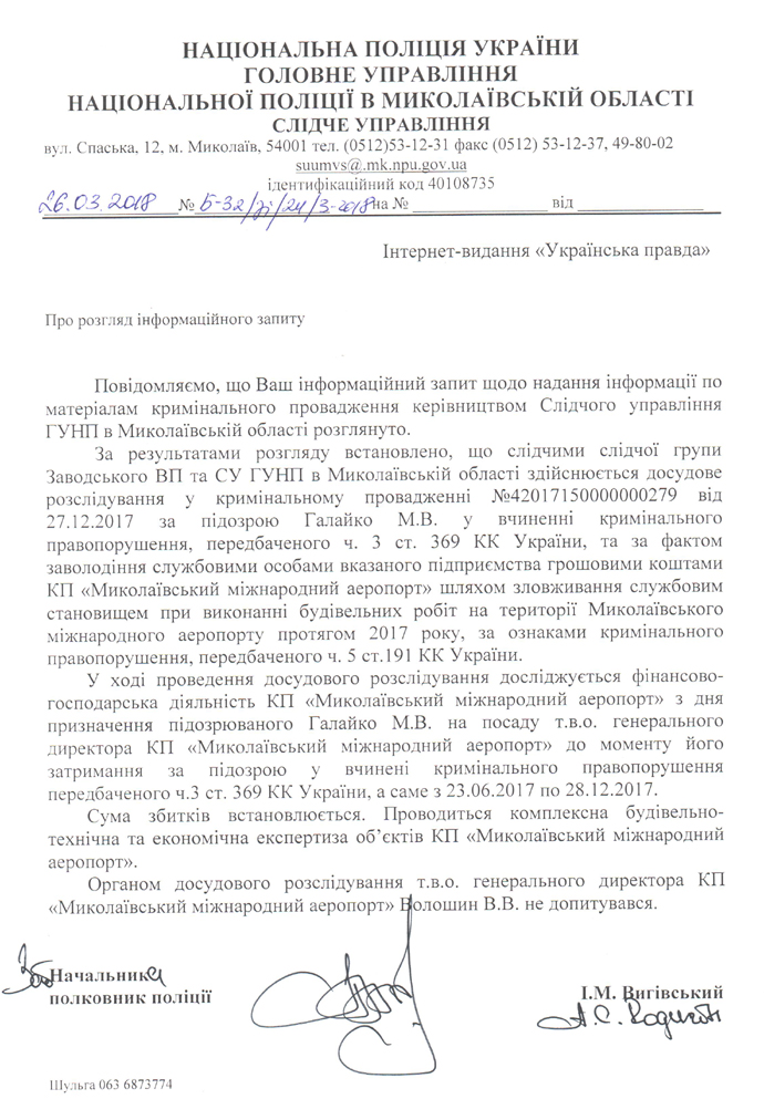 У поліції додали, що досліджується фінансово-господарська діяльність КП "Миколаївський міжнародний аеропорт" з дня призначення підозрюваного Михайла Галайка на посаду т.в.о. гендиректора летовища до моменту його затримання за пропозицію хабара (з 23 червня по 28 грудня 2017 року).