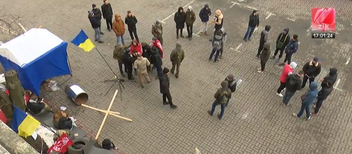 Як видно з сюжету, молодики принесли і розклали шини, встановили два намети, що використовуються для розповсюдження агітматеріалів, і поставили вздовж будівлі декілька дерев'яних "їжаків" зі стрічкою колючого дроту.