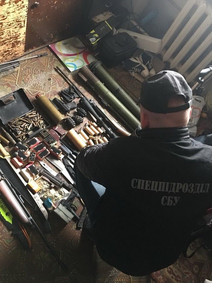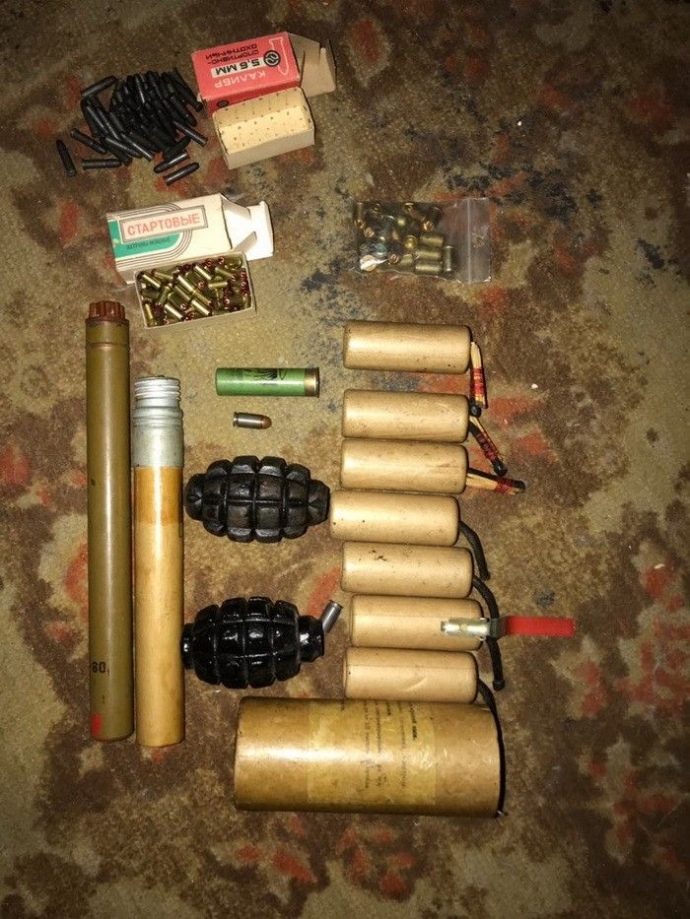 Під час обшуків за його місцем проживання та роботи правоохоронці вилучили "сім пістолетів та револьверів, три гранати Ф-1, тротилову та димову шашки, сім вибух-пакетів, сигнальну міну, сім одиниць холодної зброї та близько тисячі набоїв різного калібру".