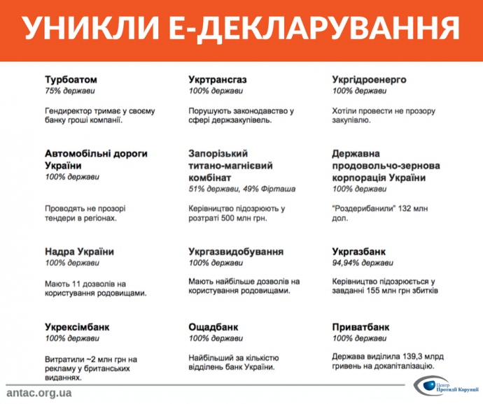 Незважаючи на те, що навіть антикорупційні активісти мають подавати електронні декларації, керівники державних підприємств, замішаних у корупційних скандалах, цього робити не повинні.