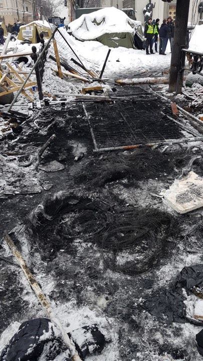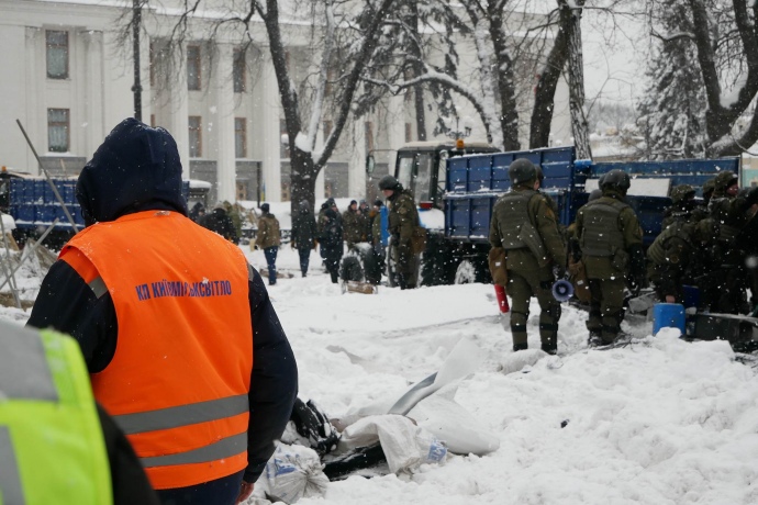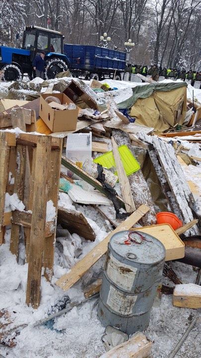 Як повідомляє кореспондент УП з-під Верховної Ради, станом на тепер Нацгвардія та комунальники залишають територію наметового містечка, з території вивозять демонтовані намети, речі мітингувальників вантажать у службові МАЗи та два трактори комунальників.