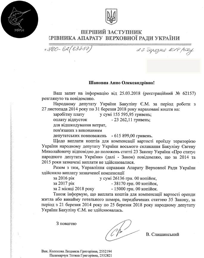 Як ідеться у документі, з листопада 2014 року до березня 2018 року Євгену Бакуліну нараховно 615,8 тисяч гривень на виконання депутатських повноважень; 155,5 тисяч гривень зарплати та 23,2 тисячі гривень оплатили за відпустку.