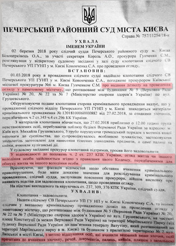 "На фото рішення суду, на підставі якого діяли співробітники НПУ в суботу під Верховною Радою. Згідно з документом, відомий суддя Білоцерковець дав слідчим дозвіл на огляд приміщення та іншого майна в наметовому містечку з метою знайти причетних до нападу на поліцейських двома днями раніше, а також предметів, якими це було скоєно", - написав Найєм.