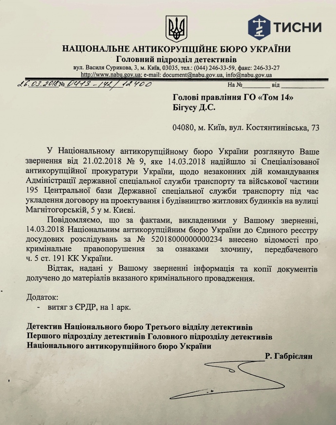 НАБУ розслідує умови та виконання інвестиційної угоди, яку уклали частина 195 Центральної бази ДССТ та ТОВ "Фонд девелопмент груп" щодо будівництва житлового комплексу для військовослужбовців на вул. Магнітогорська, 5 у Деснянському районі Києва.