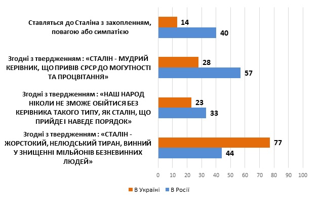 "Мудрим керівником" Сталіна в Україні вважають 28% населення (у Росії 53%), потребу в керівнику такого типу, як Сталін, висловлюють 23% українців і 33% росіян, а жорстоким нелюдським тираном Сталіна вважають 77% українців і тільки 44% росіян.