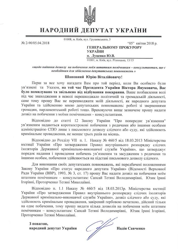 Народний депутат Надія Савченко, яка знаходиться під арештом у слідчому ізоляторі СБУ, просить генерального прокурора Юрія Луценка та омбудсмена Людмилу Денісову надати дозволи на її побачення з її офіційними помічниками-консультантами.