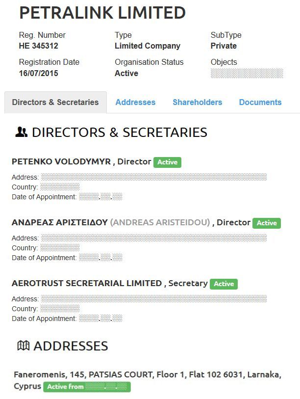 За даними з відкритих джерел, Petralink Limited було створено в липні 2015 року, її директорами значаться Володимир Петенко й Андреас Арістейду (Ανδρεασ Αριστειδου).