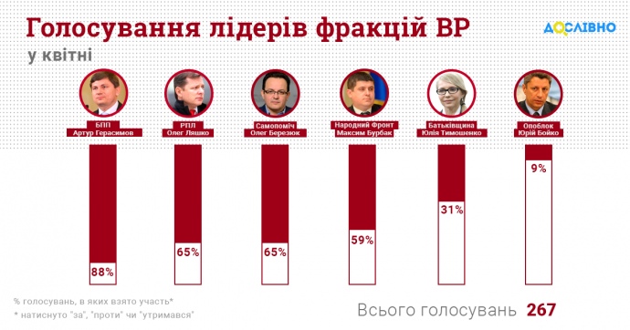 Співголова фракції "Опозиційний блок" Юрій Бойко та лідер фракції "Батьківщина" Юлія Тимошенко проігнорували найбільше голосувань Верховної Ради у квітні.