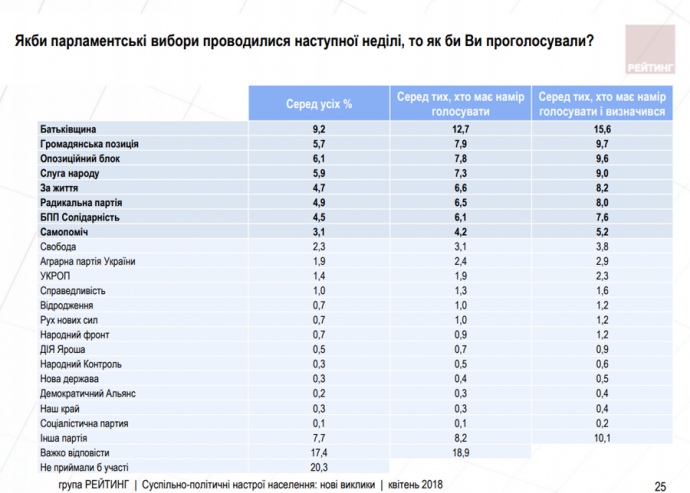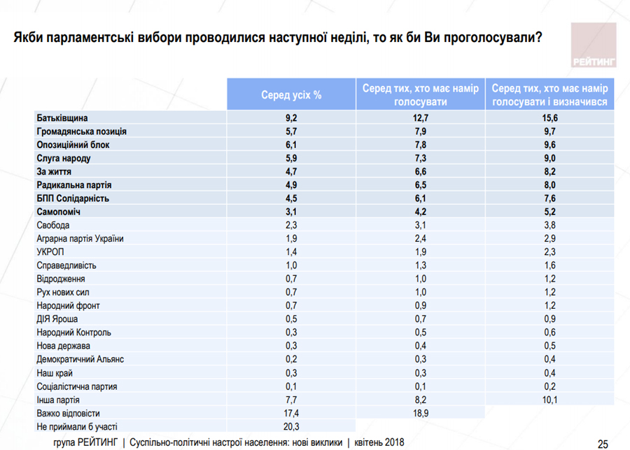 Водночас, серед тих, хто мають намір голосувати і визначився з вибором, за "Батьківщину" проголосували б 15,6%, "Громадянська позиція Анатолія Гриценка" – 9,7%, "Опозиційний блок" – 9,6%, партію "Слуга народу" – 9%.