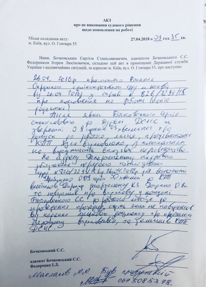 "Сьогодні Сергію Бочковському не дали приступити до виконання посадових обов’язків. Зокрема свого керівника, поновленого на роботі вчорашнім рішенням Окружного адміністративного суду м. Києва, не допустили до робочого місця працівники пропускної служби ДСНС. Вони виконували вказівку керівника департаменту кадрового забезпечення ДСНС О.В. Доценка, який послався на очікування результатів певних процедур Кабінету Міністрів України", - розповів захисник Бочковського Ігор Федоренко.