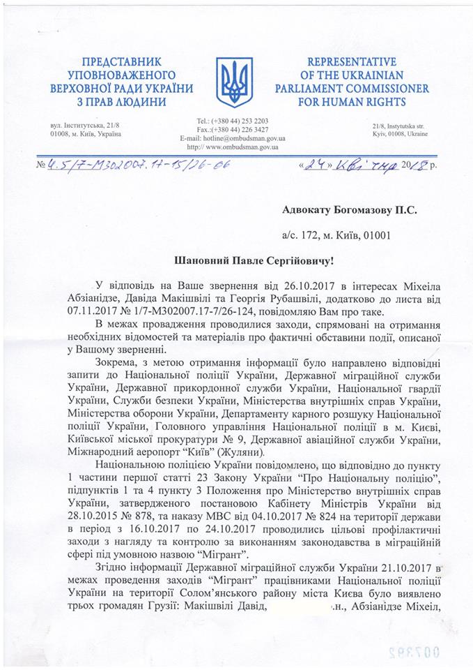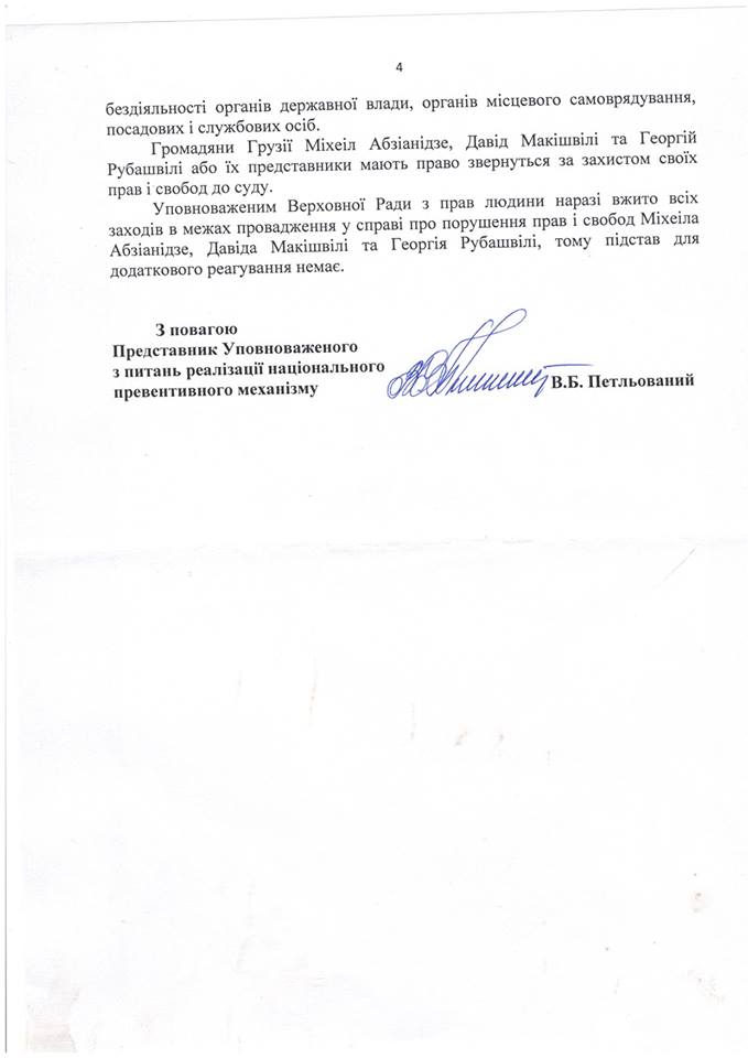 "Уповноваженим Верховної Ради з прав людини наразі вжито всіх заходів в межах провадження у справі про порушення прав і свобод Міхеіла Абзіанідзе, Давіда Макішвілі та Георгія Рубашвілі, тому підстав для додаткового реагування немає", – переконують в омбудсмена.