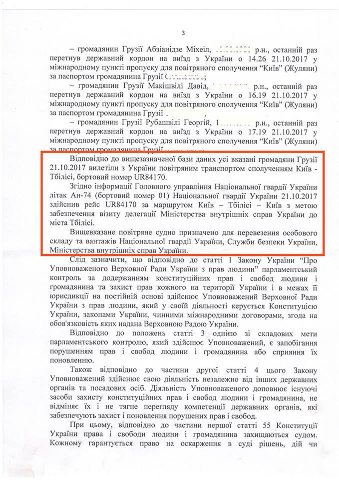 "Усі вказані громадяни Грузії 21.10.2017 вилетіли з України повітряним транспортом сполучення Київ – Тбілісі, бортовий номер UR84170", – зазначається у відповіді.