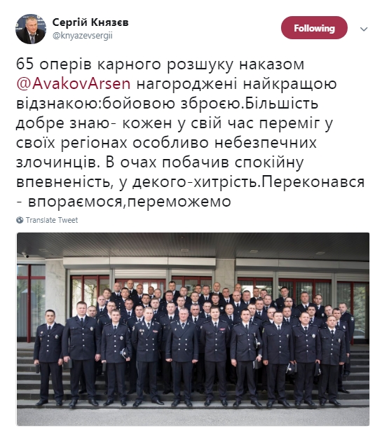 "65 оперів карного розшуку наказом Арсена Авакова нагороджені найкращою відзнакою: бойовою зброєю ... Кожен у свій час переміг у своїх регіонах особливо небезпечних злочинців. В очах побачив спокійну впевненість, у декого - хитрість", - зазначив глава НП.