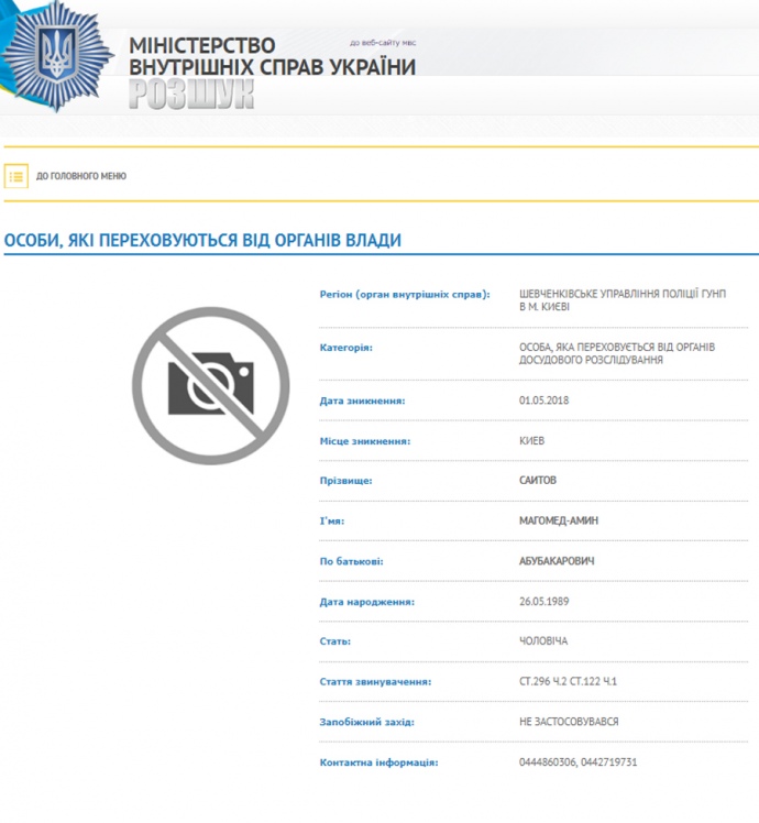 Інформація про Саітова, що переховується від органів влади, розмішена на сайті МВС.